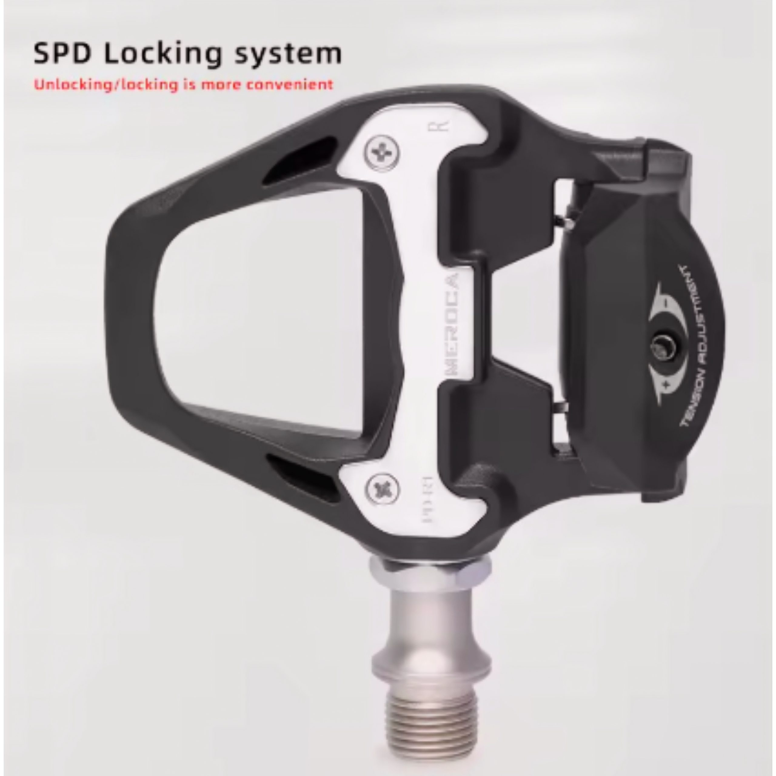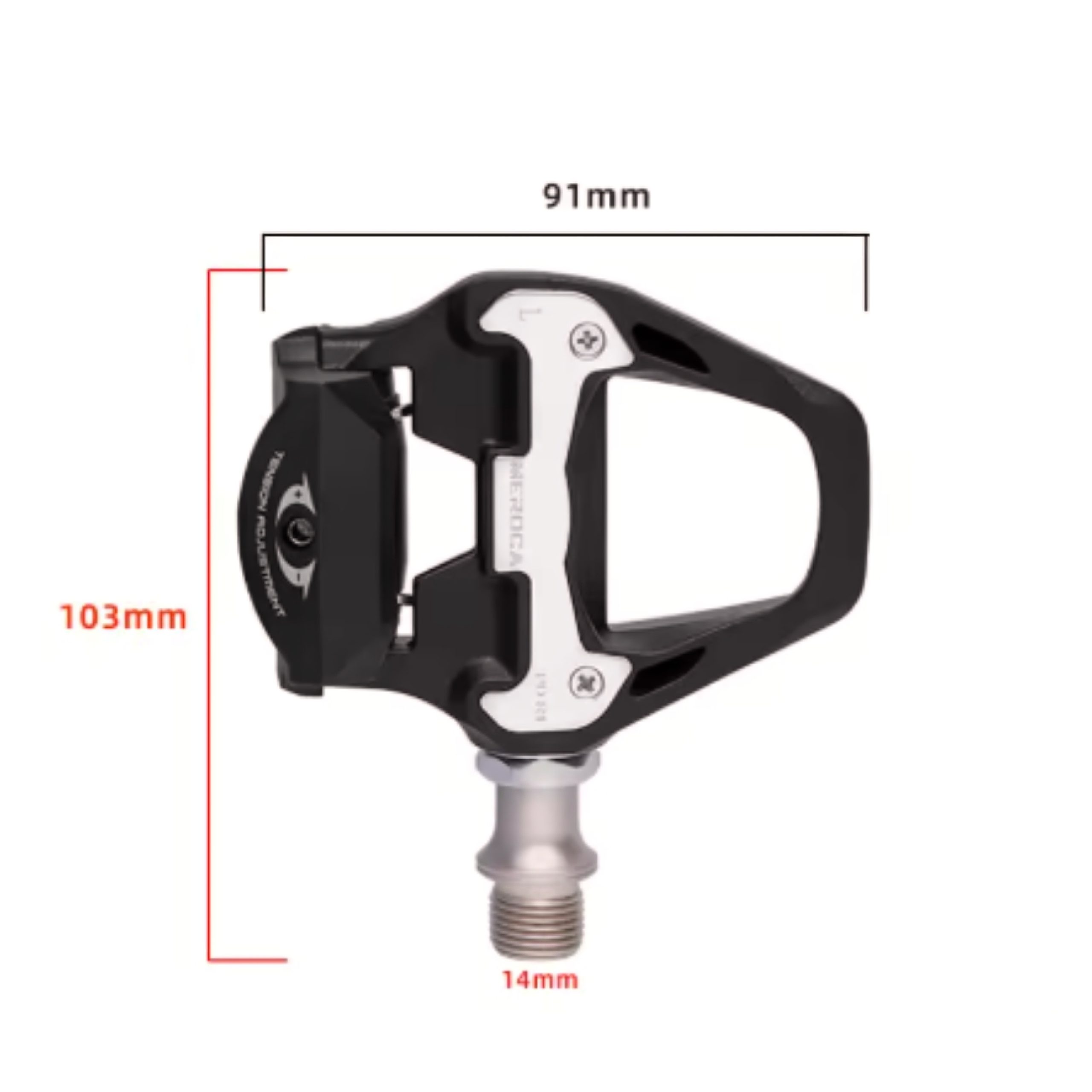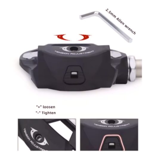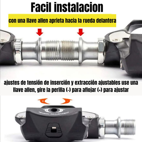 Fácil instalación : apretar con una llave Allen del numero 6 hacia el lado de la rueda delantera para apretar el pedal a la bicicleta , para ajustar el muelle de tensión de la cala al pedal debe ajustar con llave Allen del numero 2,5.